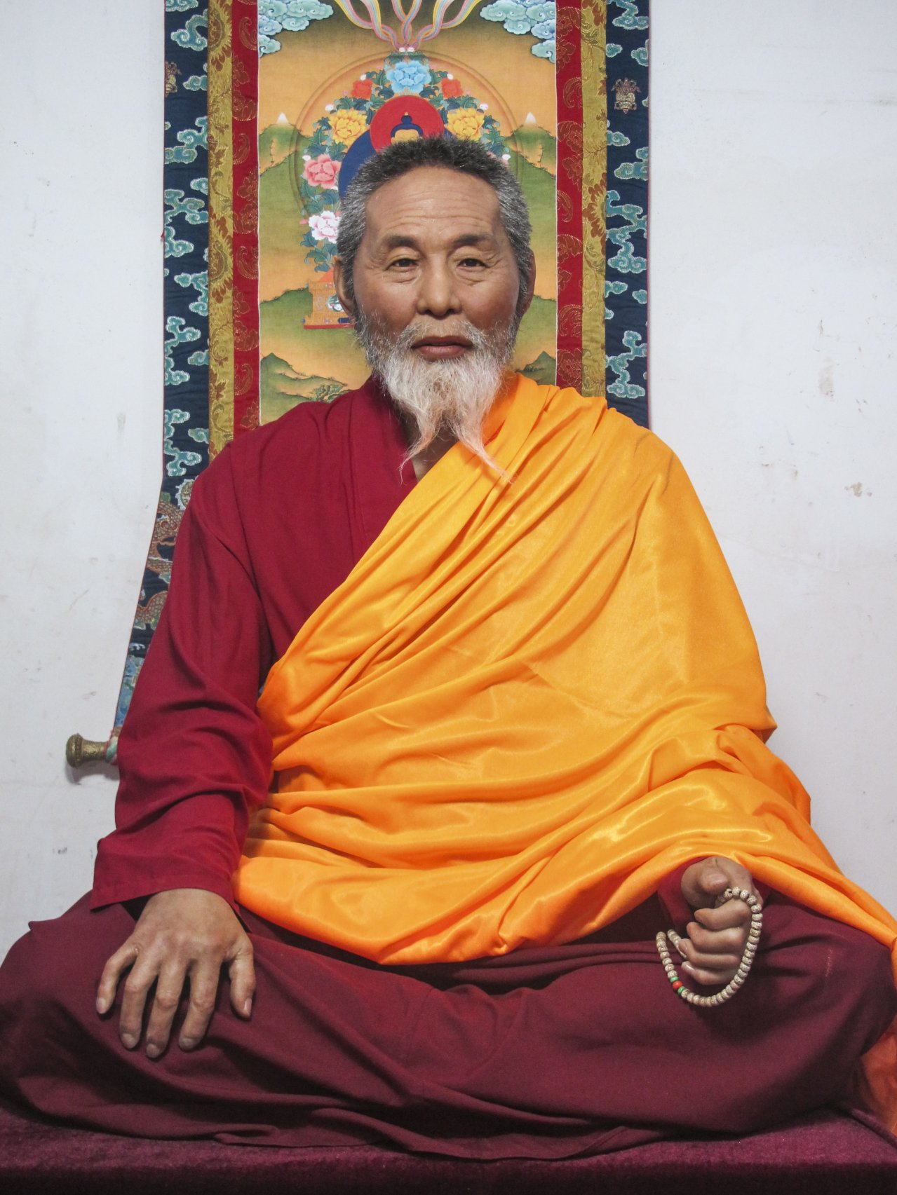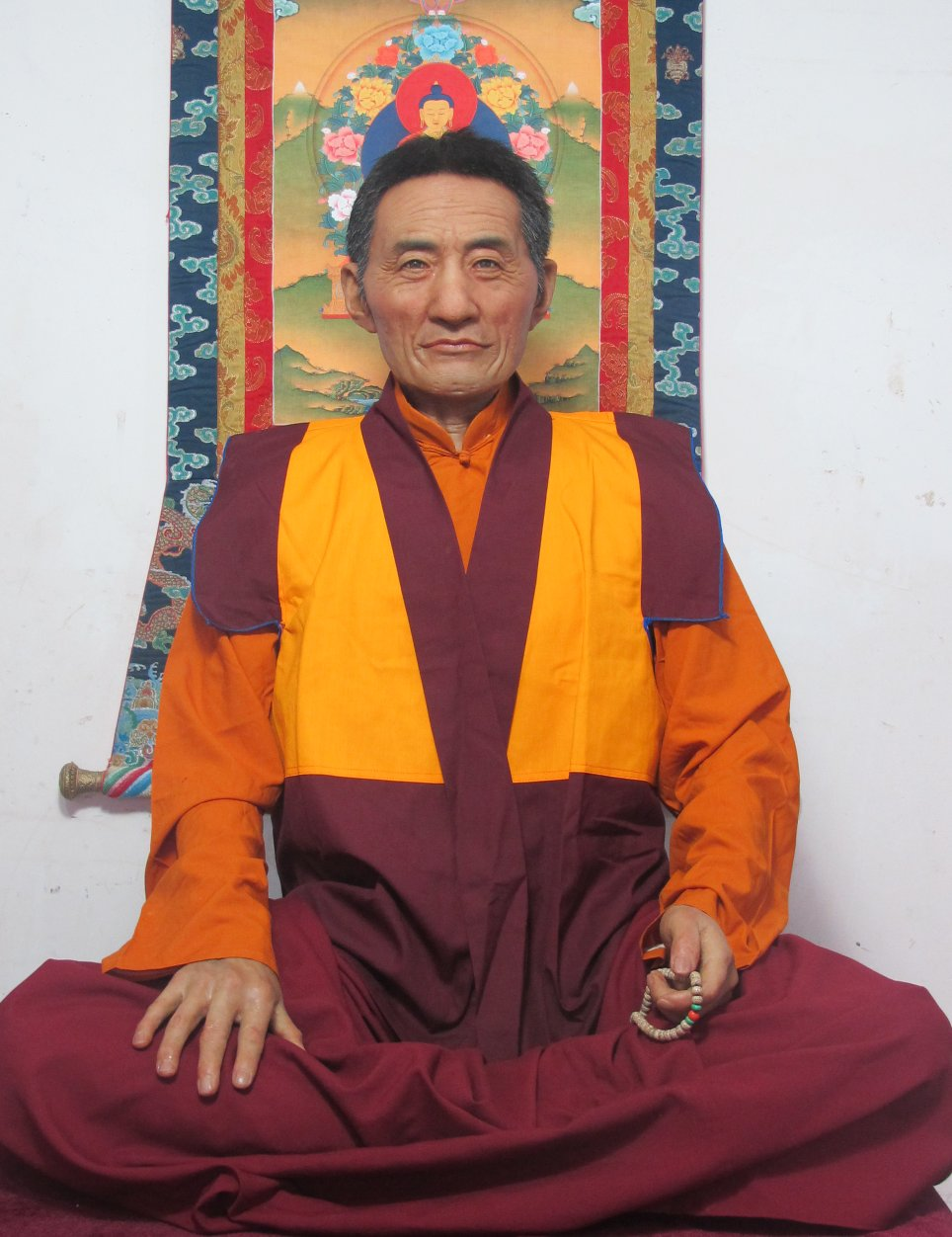 2009年初夏,随同几位领导去成都出差,本想找一位茶叶公司老总,却机缘巧合的遇见了秋吉桑宝上师,谈话余,上师让我们同行几人随便写一个字,随后,逐一为我们每个人做了切合自身的智者开示。上师在诸多同仁跟前给我了很多处理家庭问题,工作问题的方式和方法,而让我记忆深刻的是上师那句"你将来会在佛像雕塑事业上做出一些绩......当时我心里在想:佛像要求高,我很担心做不好,也总害怕接触佛像又怎么可能在做佛像事业上有成绩听秋吉桑宝上师的话语在几个月后得到了证实。从成都回西安不久,我就经手了晋美彭措法王硅像的制作,之后又接手寺阿秋喇嘛硅像的制作。之后,制作藏地喇嘛像越来越多,在藏地著名工艺大师降央师父的指点下,做的硅像不仅越来像,衣服覆盖的地方也做的越来越细致。制作喇嘛像让我们了解了藏地佛像要求的精细,也让我们学习到了僧人师父认细心,精益求精的做事态度和平易近人,包容谦虚的做人态度。